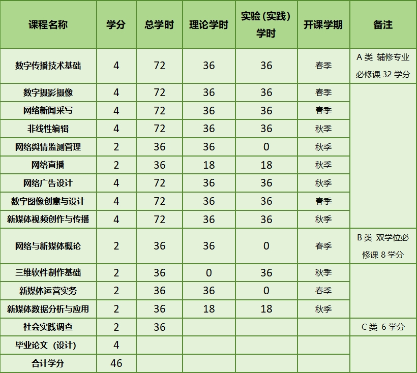 网络与新媒体辅修专业通过新媒体视频创作与传播、网络直播、数字摄影摄像、数字传播技术与基础、非线性编辑、新媒体数据分析与应用等主要课程的学习与实践,培养具有互联网思维,掌握新闻传播规律和新媒体传播特征,能够从事网络和新媒体领域的内容生产、传播和一般经营业务的复合型、创新型人才。