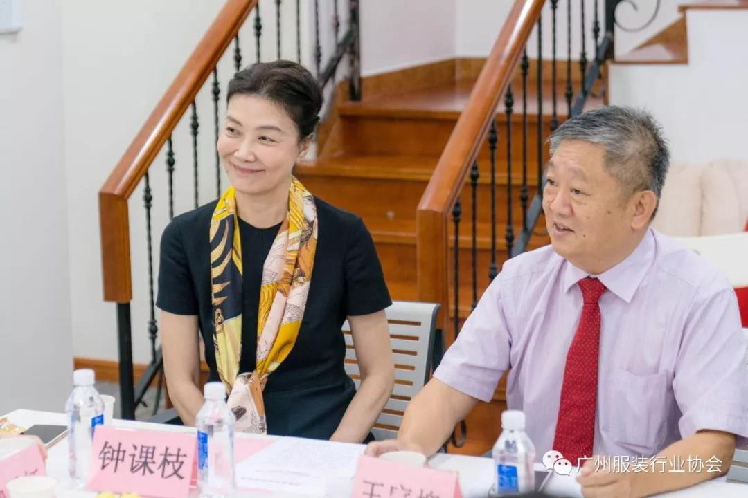 太阳集团2138网址王庭槐校长(右)与广州服装行业协会钟课枝会长(左)等服协代表交流