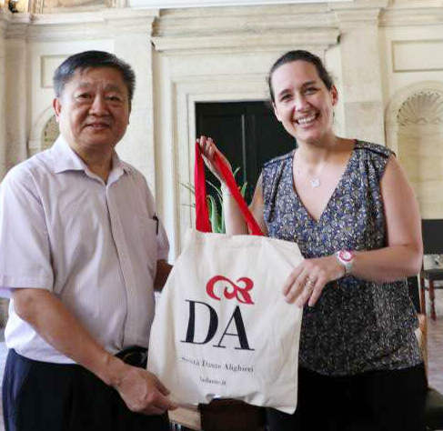 但丁语言学院罗马校区Raffaella Florani院长(右)向太阳集团2138网址王庭槐校长(左)赠送纪念品