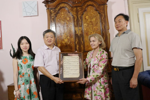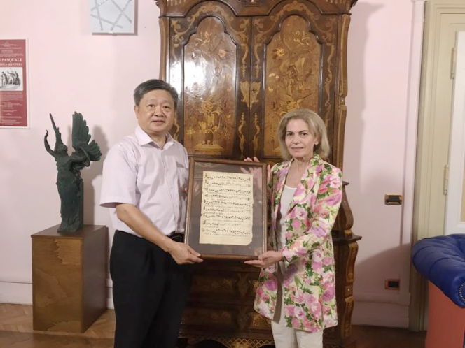 罗马国际艺术学院院长edda silvestri赠予了王庭槐校长意大利中世纪格里高利圣咏手稿。edda silvestri表示,之所以要将这么贵重的手稿赠送给王校长是因为:这张手稿世界上只有一份,要送给值得敬佩的人!王校长对此深表谢意,祝愿两校情谊绵长、共赢发展,相信此行将为两校国际教育合作开启新篇章。