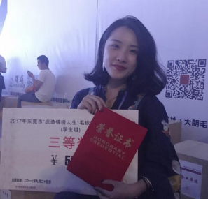 “要非常努力才能看起来毫不费力”这是晓婷一直以来对自己的态度,一上大学就明确自己的方向,不断努力。宿友总是能在宿舍的角落里看到她一针一线的状态,大学期间获得了不少服装大赛的奖杯,有德永佳优秀奖、2017年东莞市“织造锦绣人生”毛织服装设计技能竞赛三等奖等。