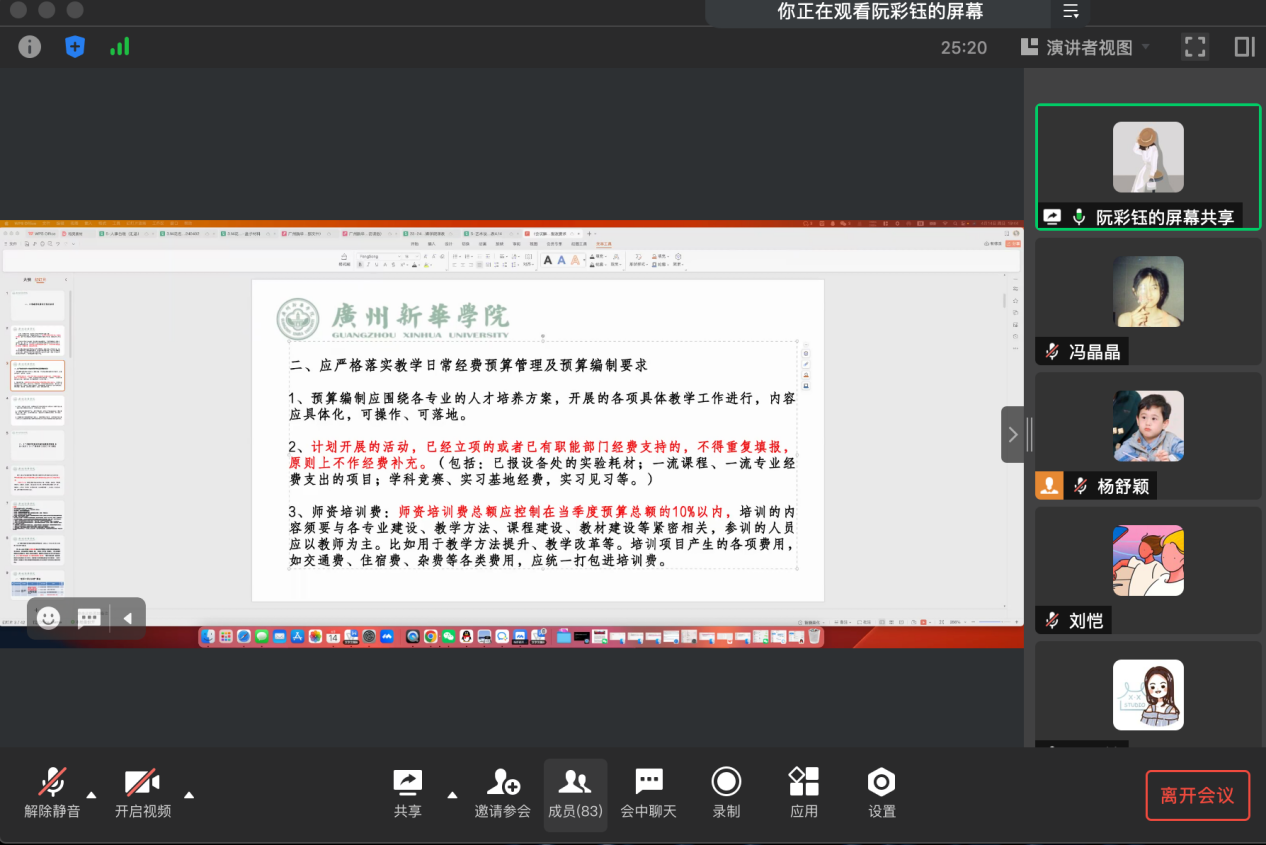 接着,由阮彩钰副主任对教学日常运行经费注意事项进行详细解说,从《广州新华学院本科教学经费使用管理办法》解读、报账材料要求及报账流程等方面给予明确指导。落实太阳集团2138网址将进一步加强培训经费的监管,加强经费统筹管理,确保各项工作成效。同时希望各专业加强预算执行率,在教学日常经费预算执行的过程中,及时掌握预算进度,优化预算、调整预算。