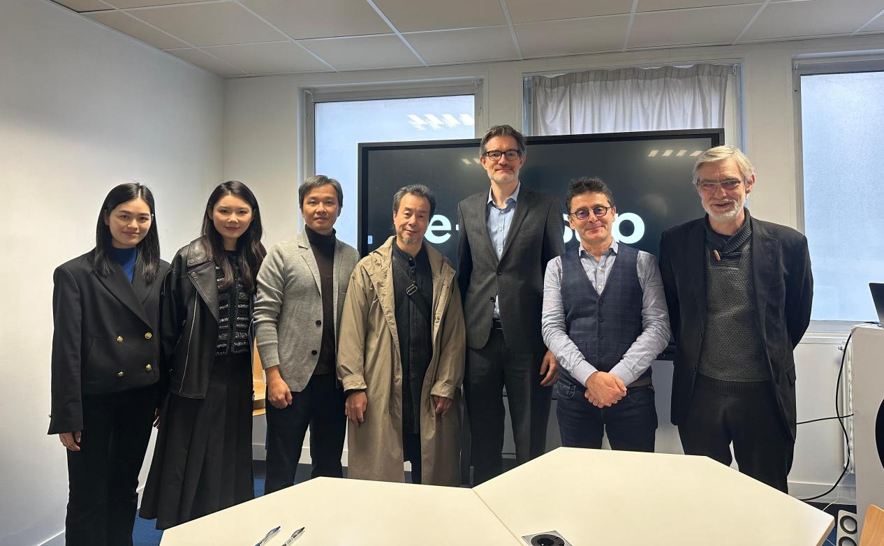 参加交流人员合影E-artsup校长Nicolas Becqueret先生(右三)、E-artsup巴黎校区校长Hubert Munier(右二)、E-artsup巴黎校区副校长Yoann Le Scoul(右一)