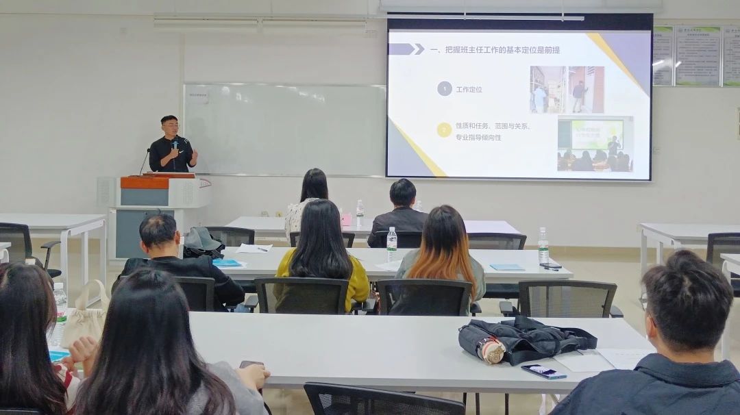 随后,优秀班主任李东山老师进行班主任工作经验分享,李东山老师从专业性、阶段性、专业性三方面讲述提升班级治理效能生动的案例,并从指导与引导相结合,集中与个别相结合,班主任工作与辅导员工作相结合,分享了自己带班的核心管理经验。以和善而坚定的态度,共情理解学生的信念,专注于解决学生学习、生活、就业等问题的方法,合作解决问题的方式及坚持到底的行动去构建温暖的师生关系。