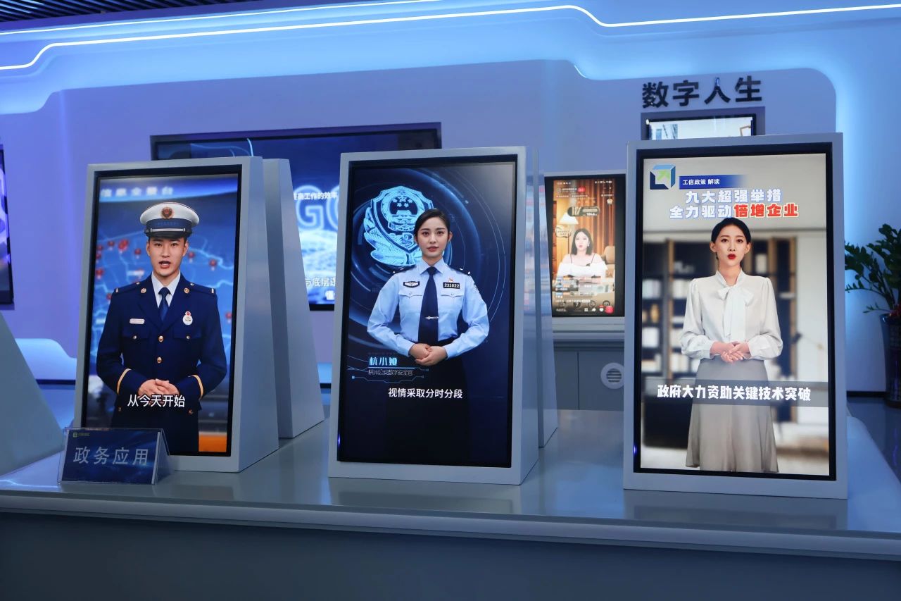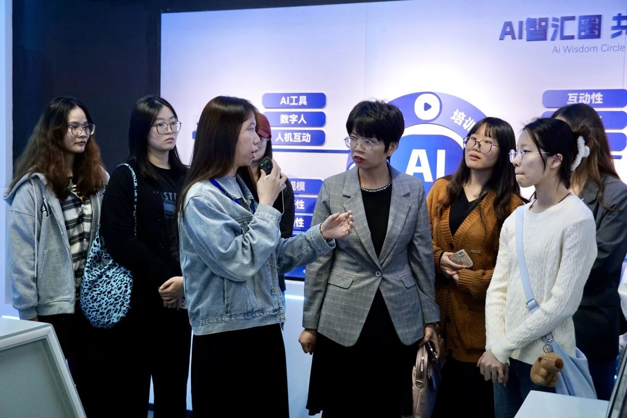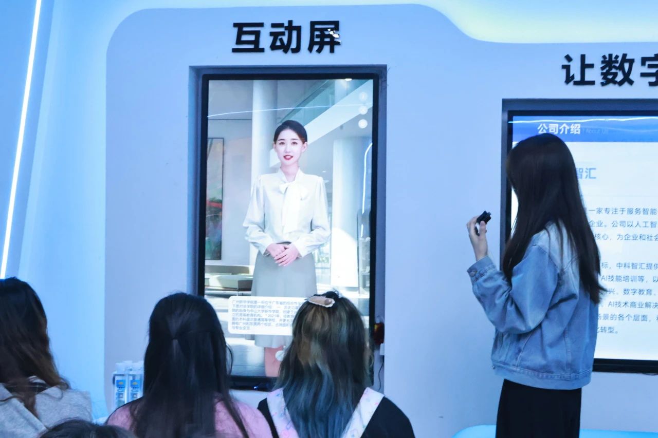 参观完文化长廊即将前往数字人展厅时,王院长还特别提到了AIGC(人工智能生成内容)认证体系,鼓励同学们考取证书提升自己的科技素养,为职业发展铺路。数字人展厅中罗列了广量集团生成的数字人,它们正逐步渗透到政策解读、教育、法律、娱乐等多个领域,不仅能够生成视频,还可以进行人机交互,只要对它提问,数字人形象就能够从知识库与搜索引擎中收集信息进行回答与对话。