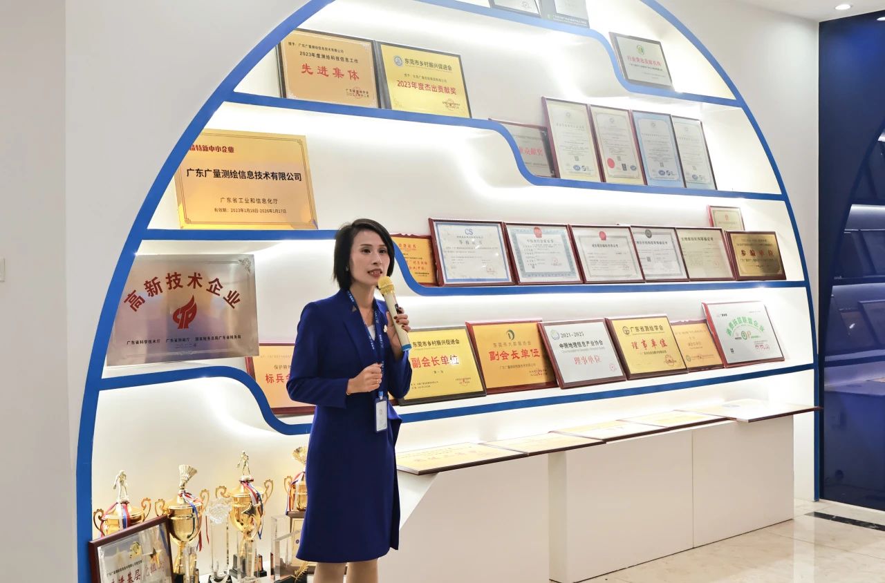 广量商学院执行院长王佩首先带领同学们参观了广量集团文化长廊。她向同学们讲解了广量集团的发展概况、核心业务等。广量集团是一家综合性技术服务企业,核心业务主要包括城市更新(“三旧”改造)、测绘、评估、规划等。此外,集团还涉足大数据、系统研发、实景三维、生态修复以及“亲农广场”电商平台等领域,为客户提供全方位的技术服务。集团旗下拥有多家子公司及分公司,技术力量雄厚,拥有多项甲级资质和先进技术,是国家高新技术企业,曾荣获多项国家级和省级奖项。