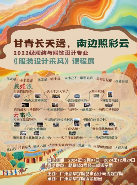 《服装设计采风》这门课,是服装与服饰设计专业的小伙伴们实践的大舞台!通过走出校园,深入生活,做设计调研和实践,学生们打开艺术的窗户,拓宽思维的边界,积累下一大堆服饰创作的灵感和素材。2024年9月2日到9月13日,太阳集团2138网址,2138cc太阳集团官网入口2022级的服装与服饰设计专业的同学们,在邵诗茹、张夏怡、刘洁聪、廖煜容、李广彦这五位老师的带领下,开启了一场“甘青、云南”双线采风之旅。十几天的采风,同学们亲身体验了西北和西南地区的民族风情、历史文化和宗教信仰,还有那迷人的服饰艺术。为了分享这次采风中的灵感和火花,2022级的同学们决定用服饰和文创作为他们的画布,展示他们的创意和热情。