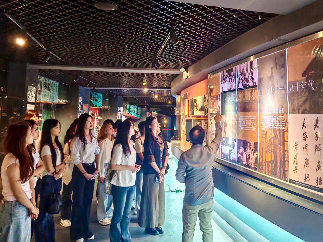 在广州广播博物馆,学生们通过珍贵的历史影像、老式广播设备、经典节目档案等展陈内容,系统了解了中国广播事业的百年发展历程及技术创新脉络。在广播博物馆讲解员的专业导览下,师生们参观馆内陈列的广播制作、发射、接收设备;包括各个历史阶段的图片、实物。通过珍贵实物展品与图文资料,师生深刻感受到传媒行业“内容为本、技术赋能”的核心理念。带队教师表示,希望通过回溯行业历史,让学生们理解声音艺术的传承与创新,激发他们以更专业的视角投入音频节目创作。