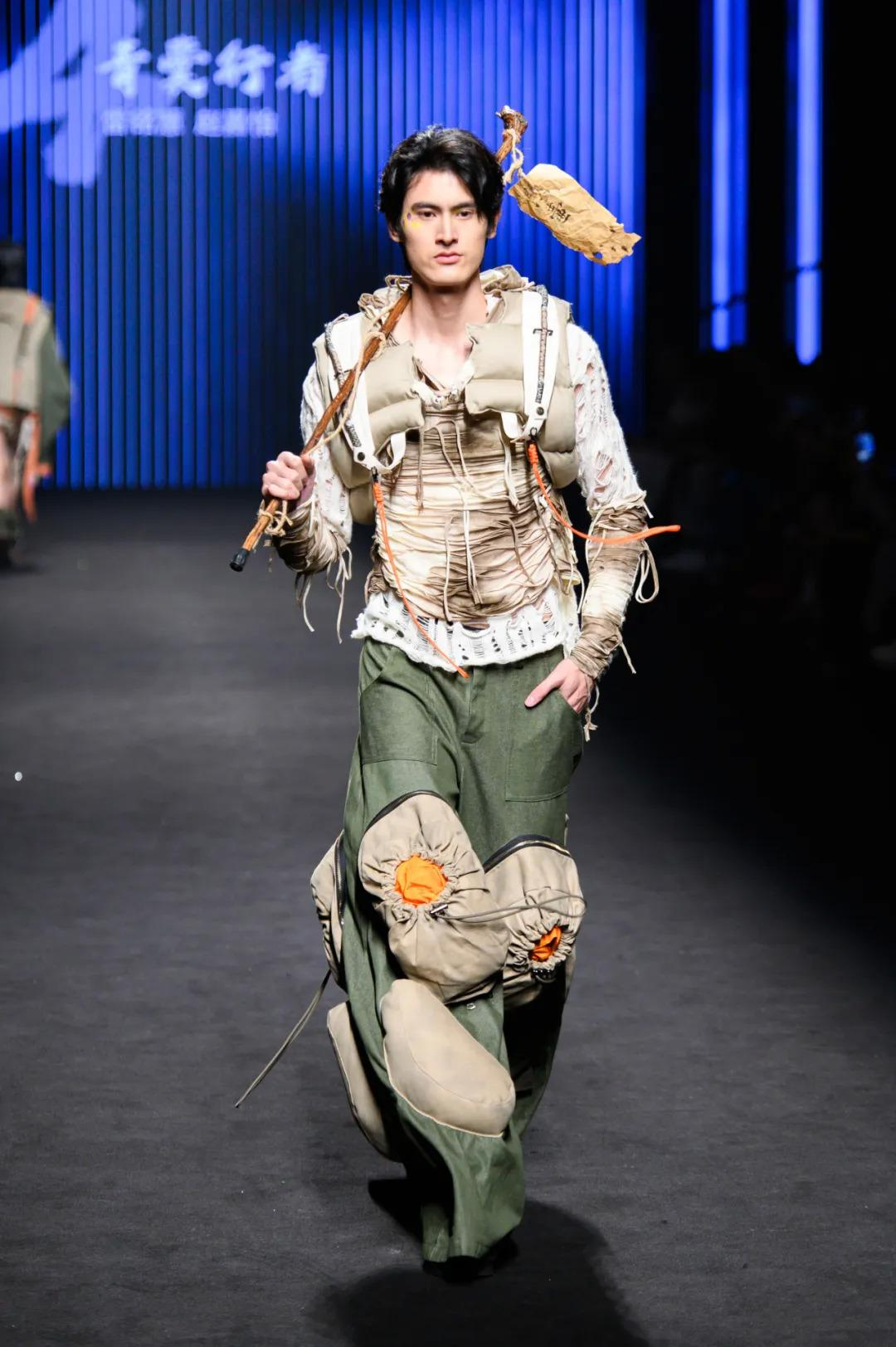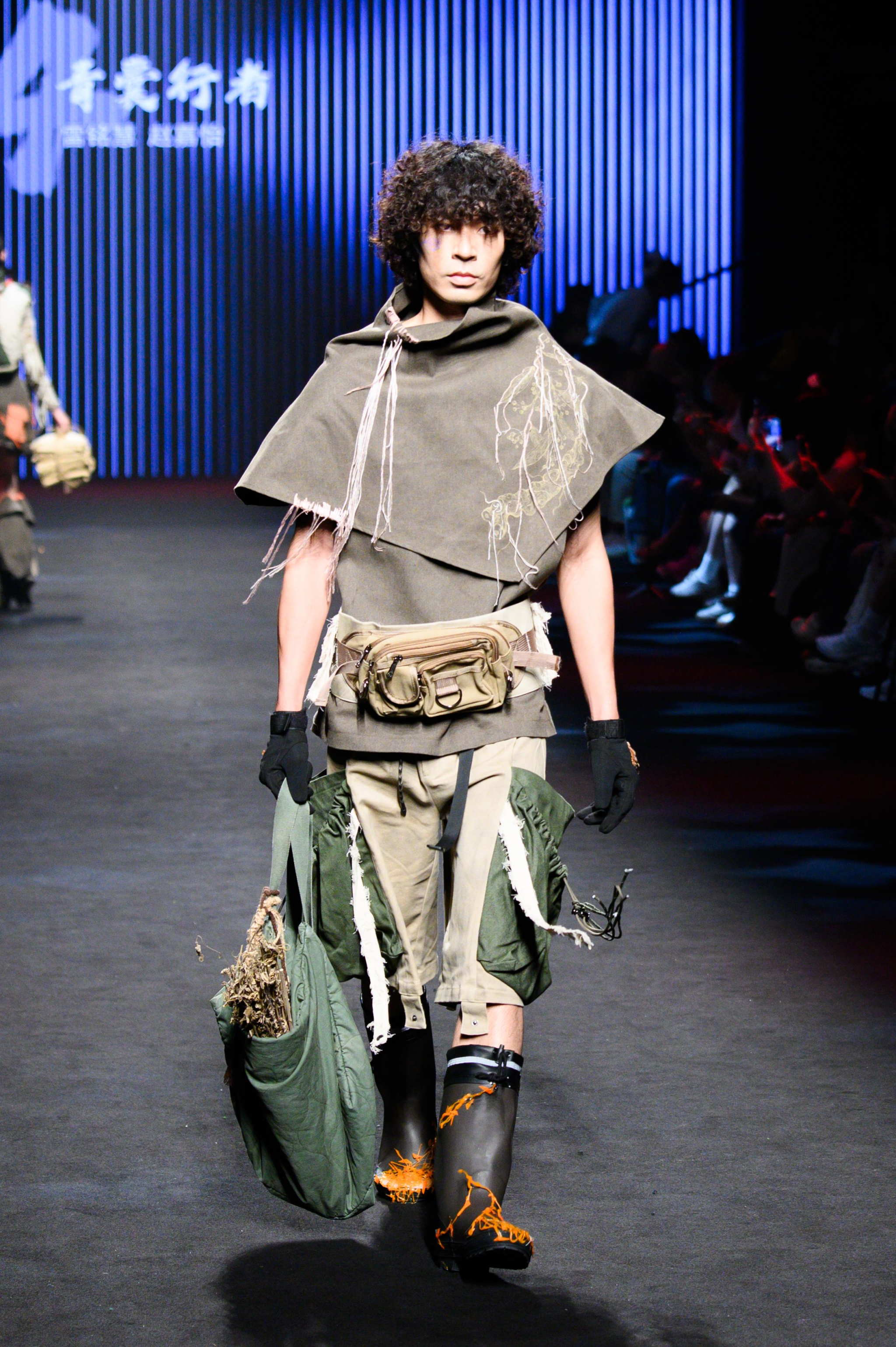 雷铭慧、赵嘉怡同学的《青囊行者》系列作品从中医文化中汲取灵感,以独特廓形为 “骨”、鲜明色彩为 “魂”,构建传统医学与现代时尚的对话场域,呼吁青年群体关注中医智慧。“青囊”二字源自中医典籍《青囊书》,是前年医道的象征,承载着悬壶济世的仁心,“行者”既是衣者,亦是传薪之人——以工装为载体,让东方医学智慧行走于当代。作品以独特的设计风格和精湛的制作工艺,巧妙融合了传统文化精髓与当代时尚元素,将东方美学韵味与可持续发展思维完美结合,获得了评委的高度赞扬。