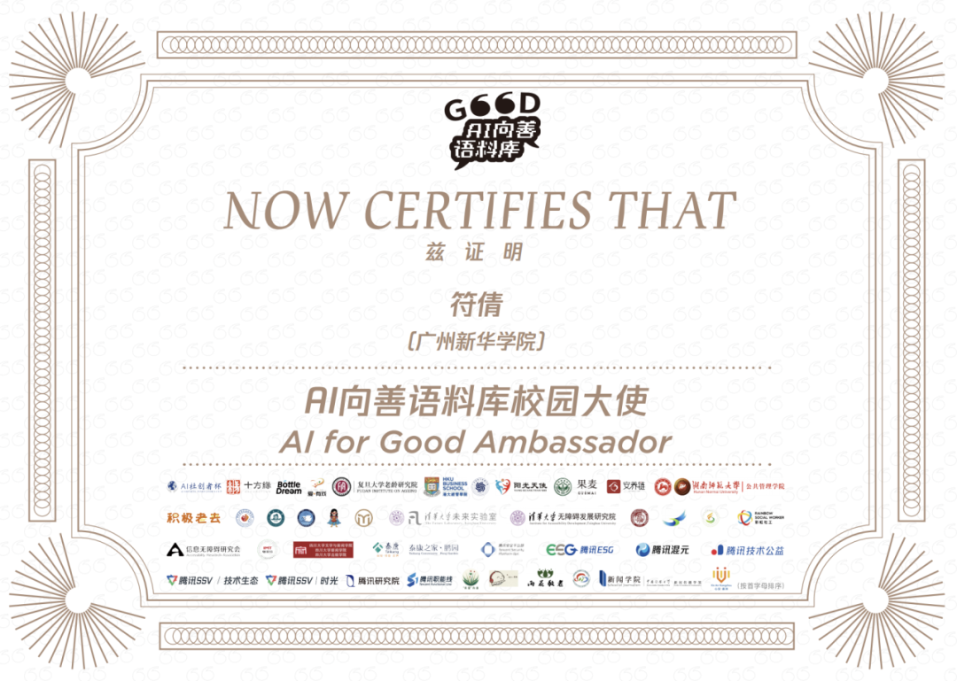 后续,近百名传播学专业的学生参与到“AI向善语料库”共创行动中去。传播学专业学生秉持着高度的责任感与使命感,深度参与到腾讯 AI 向善语料库的建设工作之中。他们充分发挥自身的专业优势,运用扎实的传播学理论知识与敏锐的洞察力,为语料库的丰富和完善贡献了大量宝贵的内容与创意。其中有68名传播学专业学生获得腾讯公司所颁发的“AI向善语料库积极贡献者”,受到腾讯公司的高度好评。