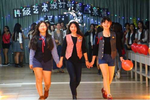 最后是全体设计师模特儿们,同时也是工作人员的溜场时刻,同学们有的叫上自己的舍友一起合照,有的叫上自己的好兄弟好闺蜜一起走秀,更令全场激动的还有情侣走秀!大家玩得都非常尽兴,老师也露出欣慰的笑容。