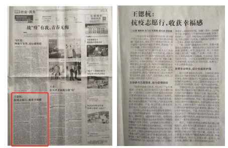其后,王锶杭又受到揭阳日报记者潘彬彬的采访,事迹登上了揭阳日报。日报上不仅详细报道了王锶杭的事迹,细微处还表达了对他的赞扬,树立了一个责任担当,不畏艰难的热血青年形象。