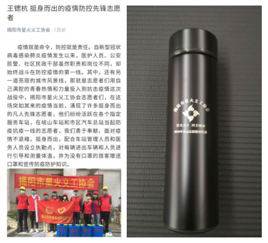 由于表现优秀,王锶杭受到了揭阳当地的星火义工协会的认可,并把他的事迹在公众号进行发表,赠予他“2020年春运志愿服务纪念杯”,以表达谢意和留作纪念。