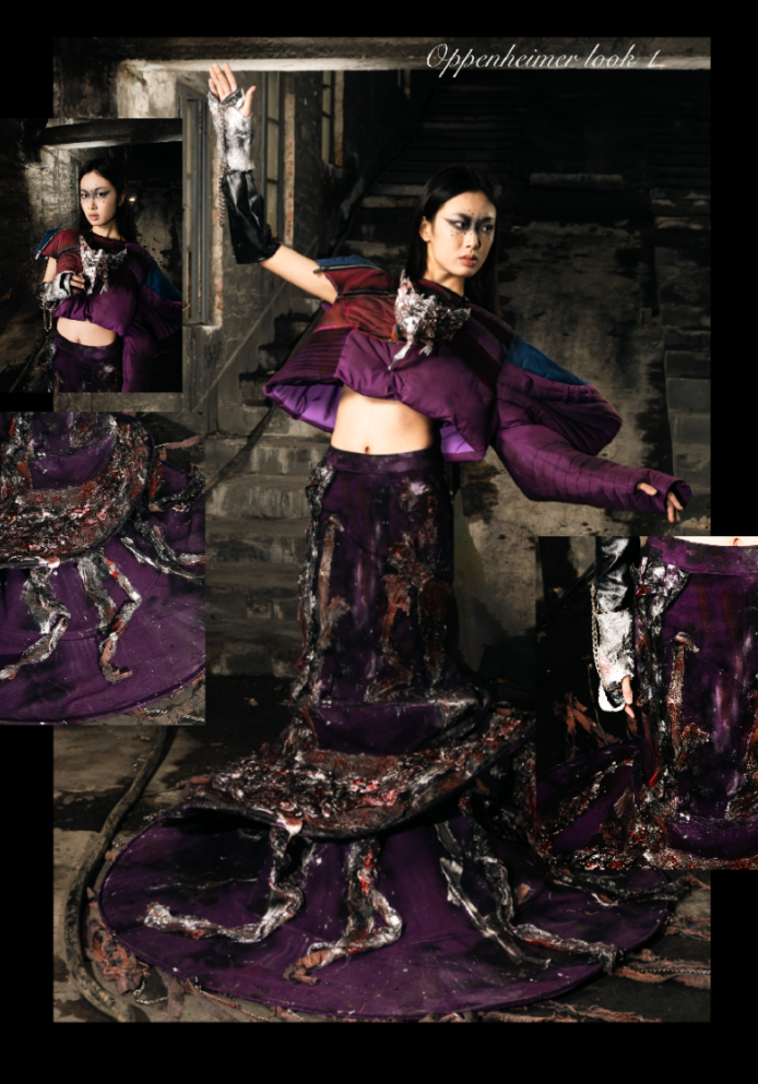 以奥本海默的一个梦为灵感设计,在他得知广岛已经被他所制作的大规模杀伤性武器原子弹摧毁了,据说那天夜里他做了一个噩梦,他幻化为《薄伽梵歌》中的毗湿奴,他成为死神,世界的毁灭者在他的梦里人类文明被核武器摧毁了。用废土风格设计语言代入到奥本海默梦中或者说想象中的末日世界场景。从而来剖析奥本海默这个人物因发明这一毁灭性武器可能带来的世界毁灭的恐惧与负罪感(通过本系列的设计来引起人们对于核武器运用的反思)。
