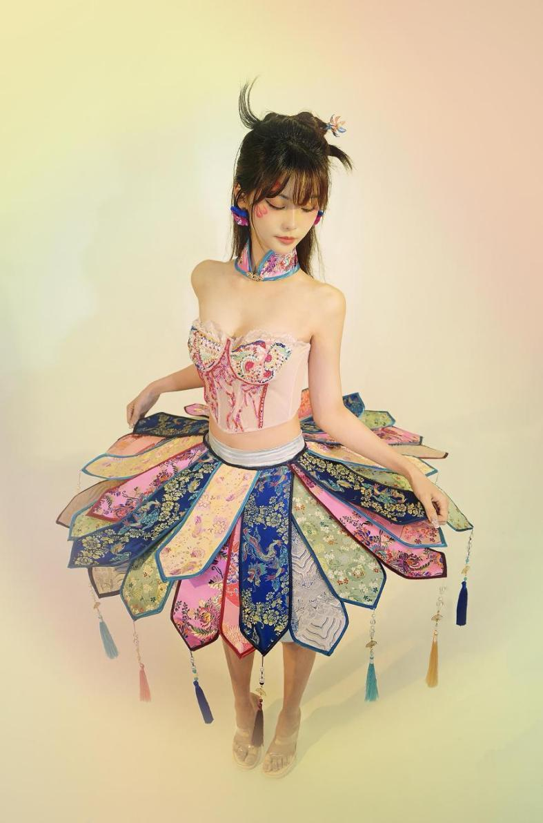 “龙生九子不成龙,各有所好。囚牛好音乐、睚眦好杀、嘲风好险、蒲牢好鸣、狻猊好坐、霸下好负重、狴犴好讼、赑屃好文、螭吻好吞。” 选取七个龙子形象特征,将其融入现代服装廓形中,呈现先锋时尚与东方美学的碰撞与融合。采用数码印花技术打造中式传统文化视角下对龙纹样的活化与创新,与现代设计理念相融合,整体视觉效果呈现出前卫之感,满足现代人们对时尚和个性的追求。