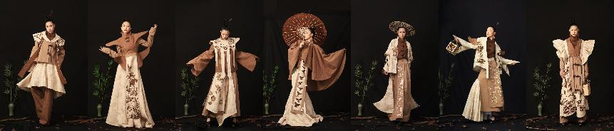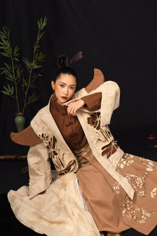 灵感来源于岭南非遗木雕,"浮笙”是对人生的消极看法的一种状态。当我们处于低谷的时候,我们总会产生消极的情绪。从而变得不自信、固执、悲观,禁锢在自己的枷锁,就像是一块“朽木”。可世事无常,人生总是充满着不可预知的变数,只有坚强起来才能够面对一切的挑战,只有石以砥焉 方能化为利。因此我们想重新赋予每一块术头新的生命,结合现代技术手法进行创新运用到服装当中,将非遗文化永恒的传承与发展下去,并为服装设计增添新的语言。