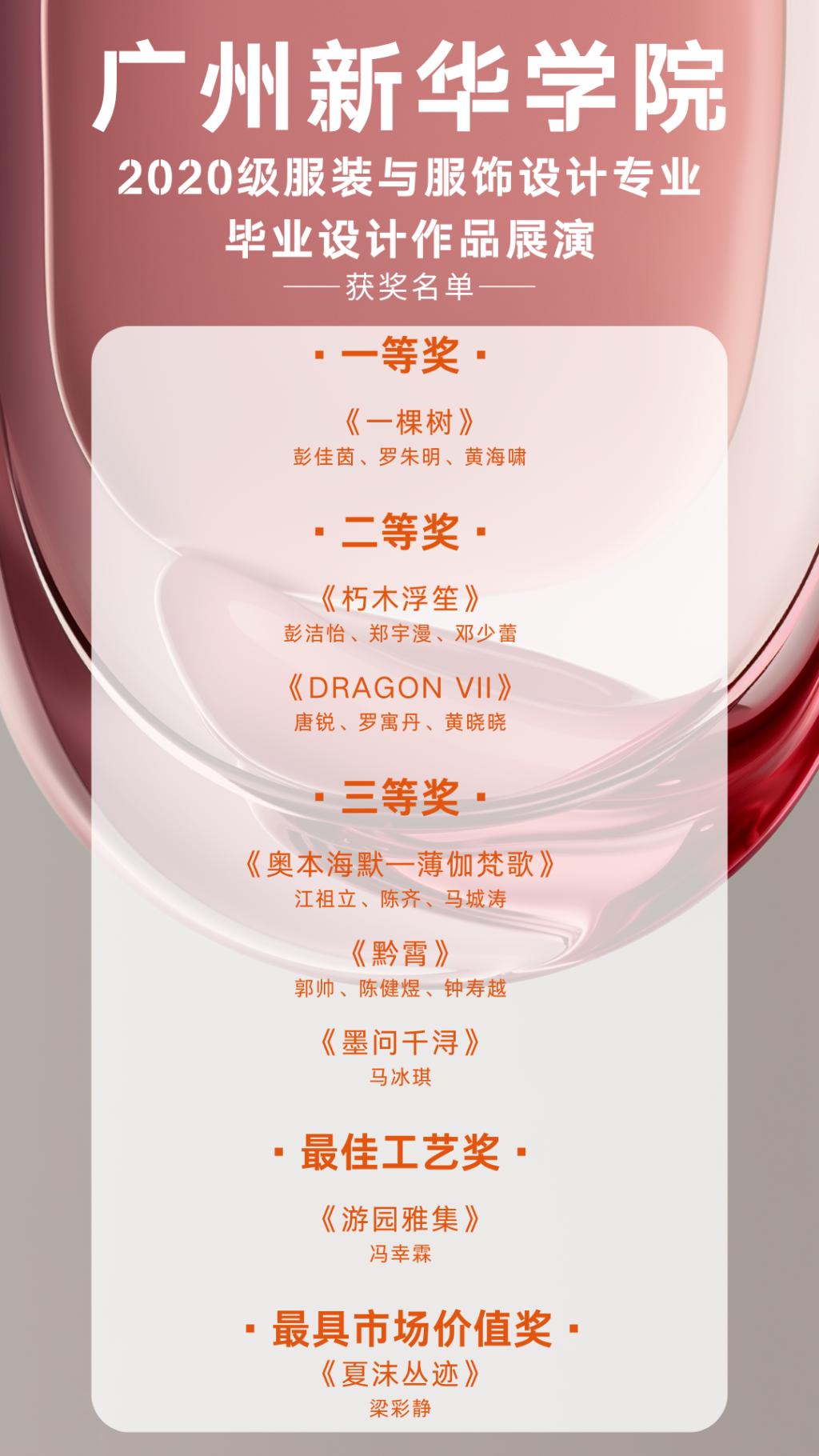经过现场的评委评审,本次2020级服装与服饰设计专业毕业展评选出一二三等奖、最佳工艺奖、最具市场价值奖五个奖项。