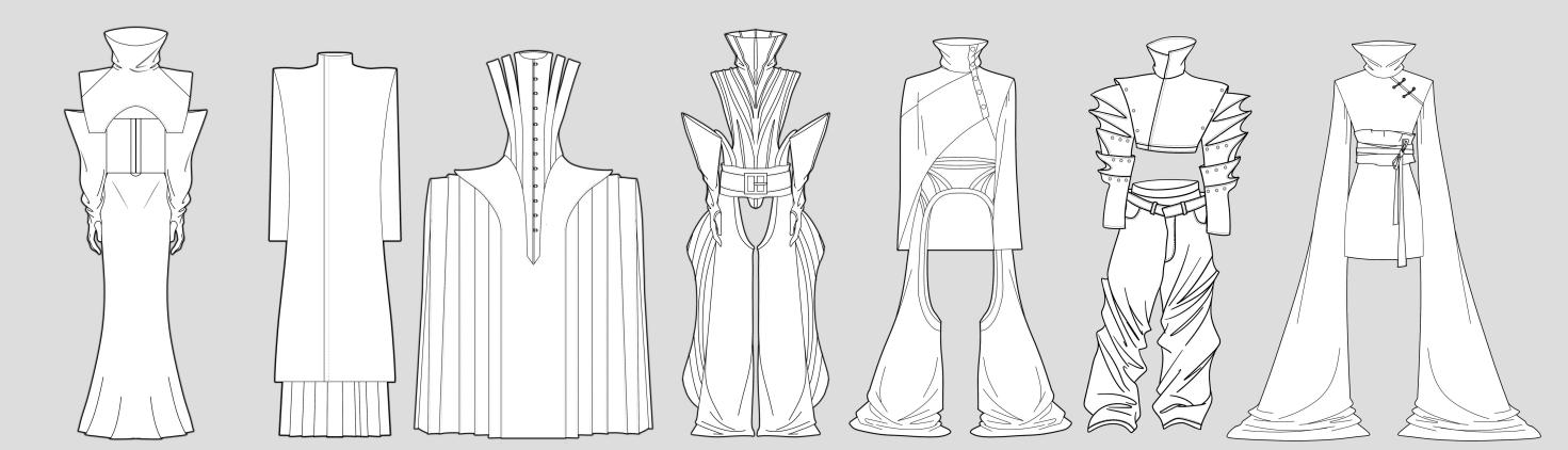 遇到的第三个问题是如何将所画的设计图呈现,团队先通过立裁的方式制作基本的造型并进行优化,后将白胚画成纸样进行成衣制作。在过程中团队进行了白胚与面料的区别分析,由于某件衣服需要裙撑,但成衣的面料重量超过了白胚的重量,所以团队需要重新制作裙撑以保证其造型不变形。