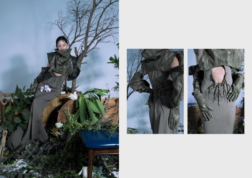 《一棵树》的设计以“枯木”和“生机”为主题,强调与自然的融合。通过面料纹理的设计呈现枯木的肌理,展现深厚的生命感;同时结合花草图案设计,呈现出“枯木逢春”的状态,实现自然与设计的完美融合。通过面料改造中泥染、植物染、破坏、折叠等手法创造具有肌理质感体现树木纹理形态的面料。