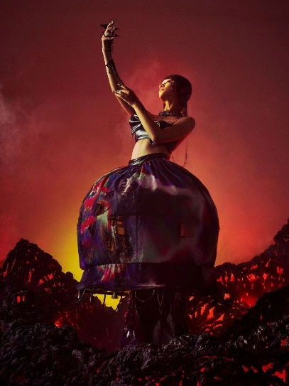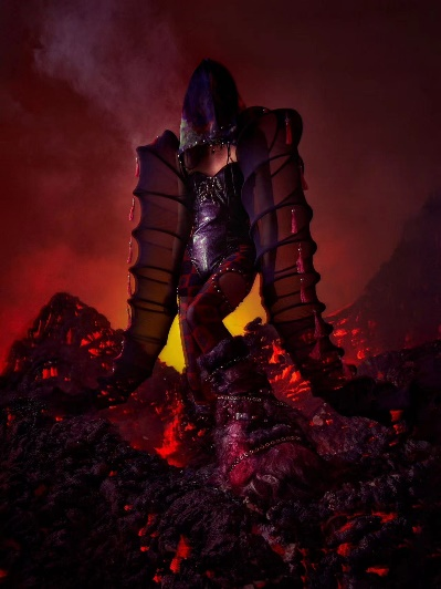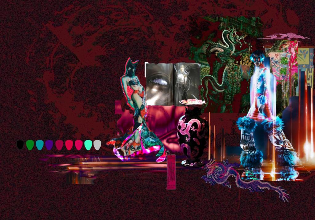 《DRAGON VII》系列设计灵感来源于中国龙生九子的古代传说。“龙生九子不成龙,各有所好。囚牛好音乐、睚眦好杀、嘲风好险、蒲牢好鸣、狻猊好坐、霸下好负重、狴犴好讼、赑屃好文、螭吻好吞。” 选取七个龙子形象特征,将其融入现代服装廓形中,呈现先锋时尚与东方美学的碰撞与融合。采用数码印花技术打造中式传统文化视角下对龙纹样的活化与创新,与现代设计理念相融合,整体视觉效果呈现出前卫之感,满足现代人们对时尚和个性的追求。