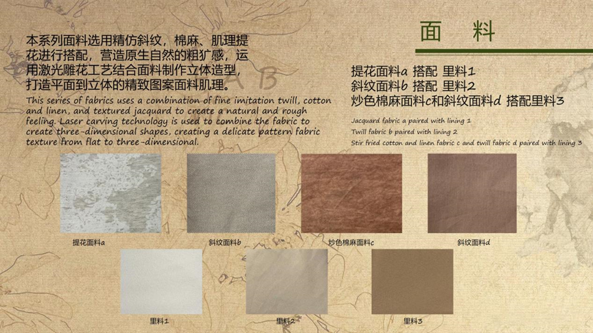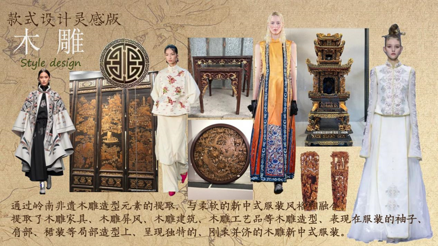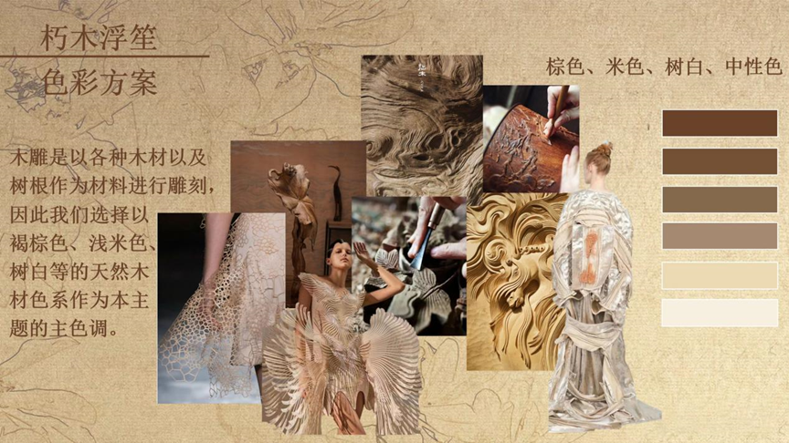 此次毕业设计的灵感来源非物质文化遗产中的木雕,木雕不仅是一种手工艺,也是一种艺术。从自然中取材,将一块普普通通的木头,通过手工雕刻的手法,重新赋予每一块朽木新的生命,通过结合现代技术手法进行创新运用到服装当中,将岭南非物质文化永恒的传承与发展下去并为服装增添新的设计语言。