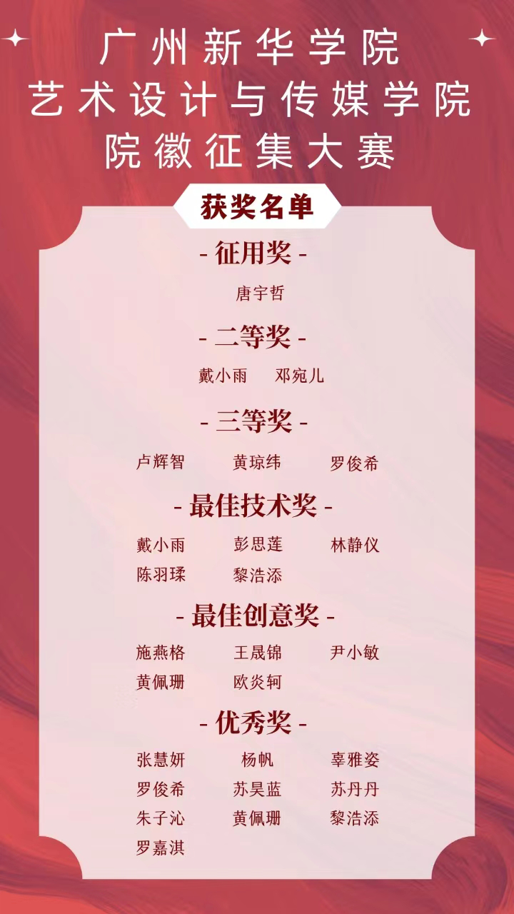 广州新华学院太阳集团2138网址,2138cc太阳集团官网入口院徽征集活动暨设计大赛颁奖典礼将在6月26号晚上19:00(周三晚)在定静1A201举行,届时期待大家的到来。一睹艺术与灵魂的碰撞。