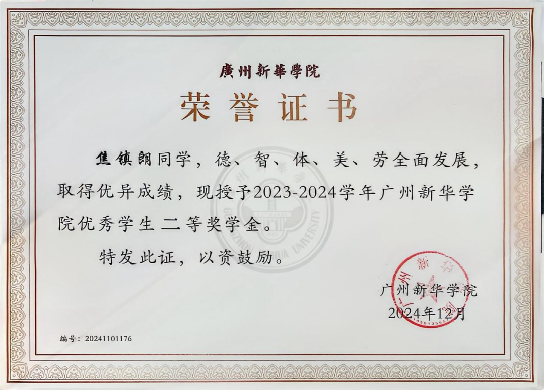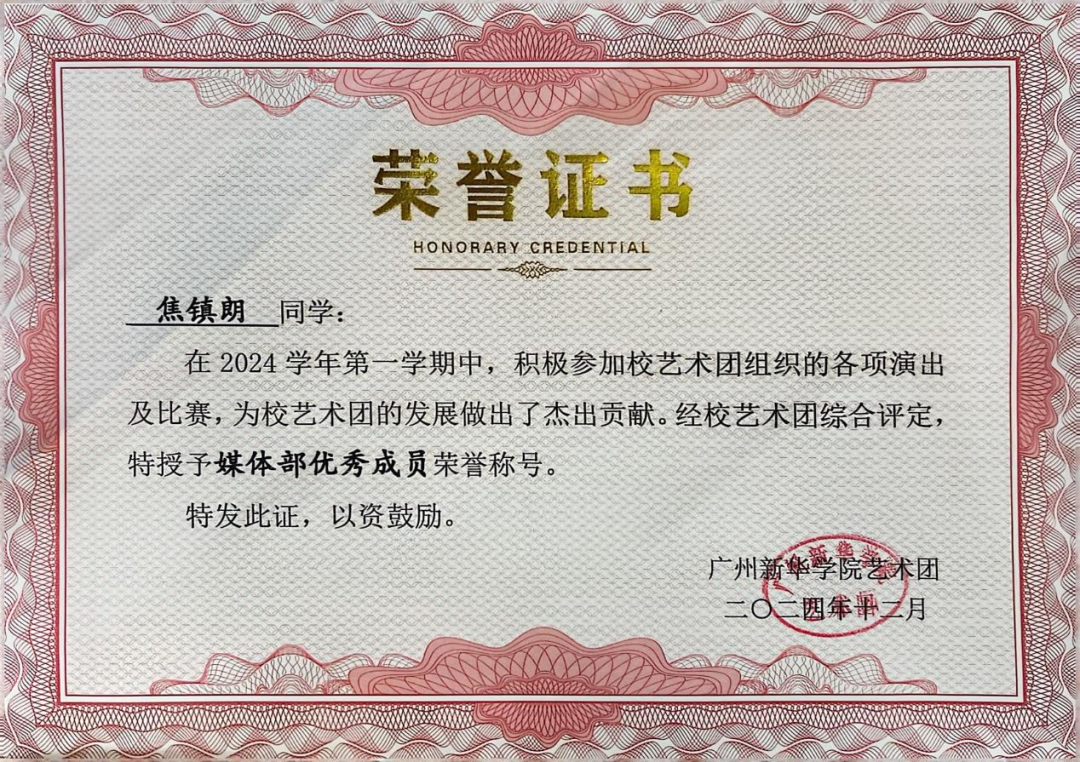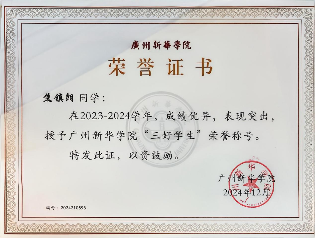 退役复学后,荣获2024学年学校优秀学生二等奖学金、2024学年“三好学生”、2024学年校艺术团优秀媒体部成员、2024年暑期三下乡制作的宣传视频获广东省“多彩乡村 共谱新篇”三等奖、2024年暑期的三下乡队伍获评“百千万工程”优秀队伍。