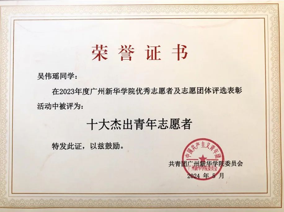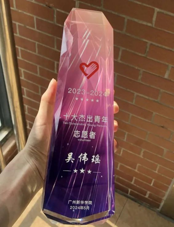 吴伟瑶同学获得“十大杰出青年志愿者“荣誉证书及奖杯