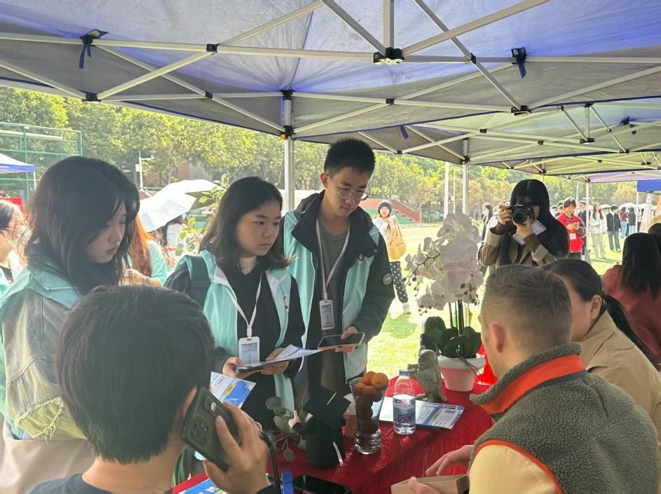 在校园招聘会中调研招聘市场的姚韬(右1)