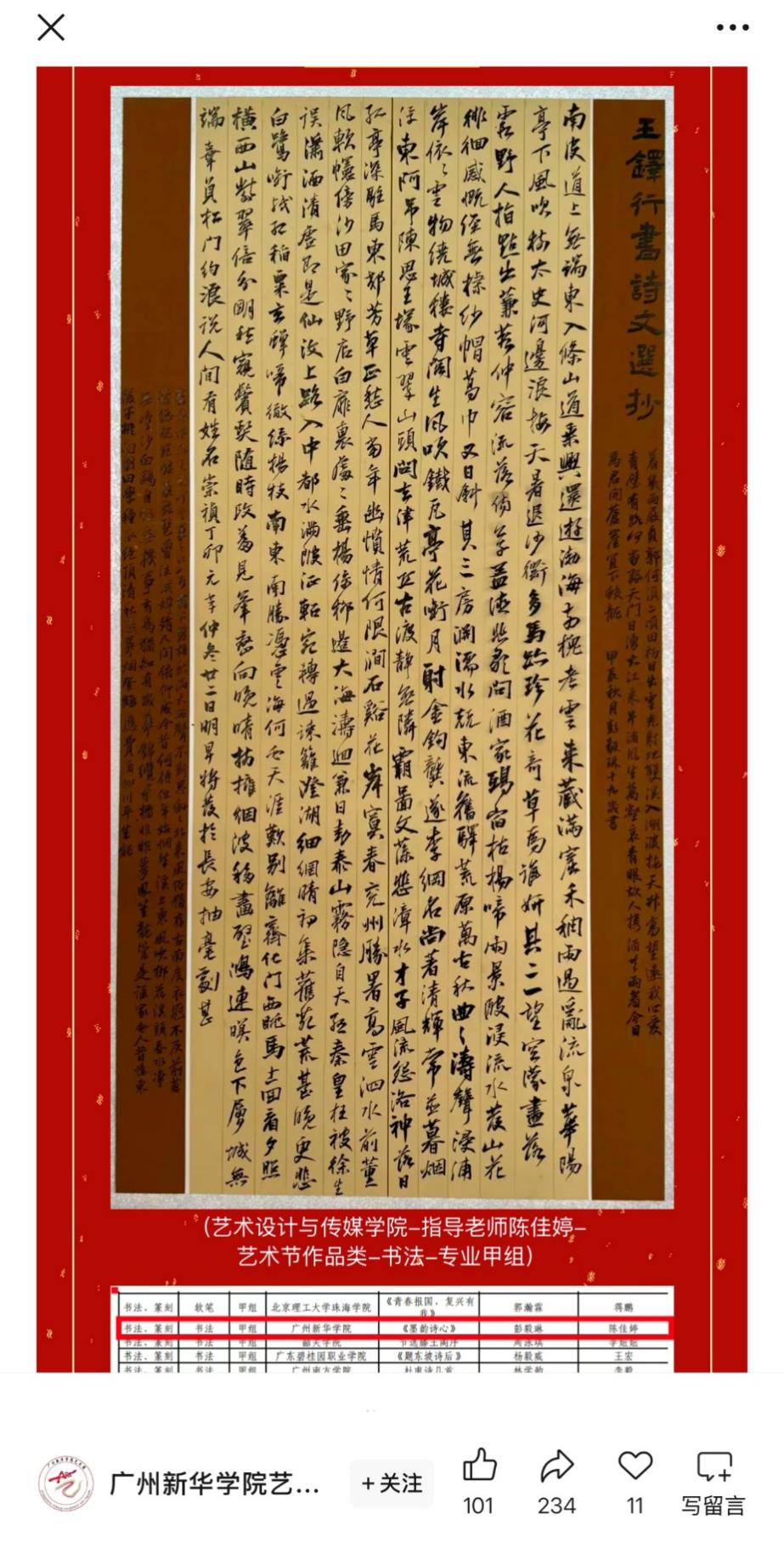 大一至大二期间,彭毅琳同学积极参加创新创业大赛,以赛促学,带动身边同学一起提升创新和实践能力。比赛过程并不是一帆风顺的。首次参加创新创业比赛的彭毅琳同学,面对决赛时间短任务重的紧急情况,多次和老师们、同伴们线上线下沟通,多次对比赛的文稿进行修改。功夫不负有心人,经过多轮比拼,她们团队最终取得了优异成绩。这次比赛让她学到了:只有通过不断地实践和调查,才能逐渐得出结论和解决问题的方法。实践出真知!除此之外,彭毅琳同学一直利用课余时间进行书法和美术作品的创作,积极参加专业比赛和展览投稿,在比赛中获得了优异的成绩,作品多次参加广东省各类作品展。