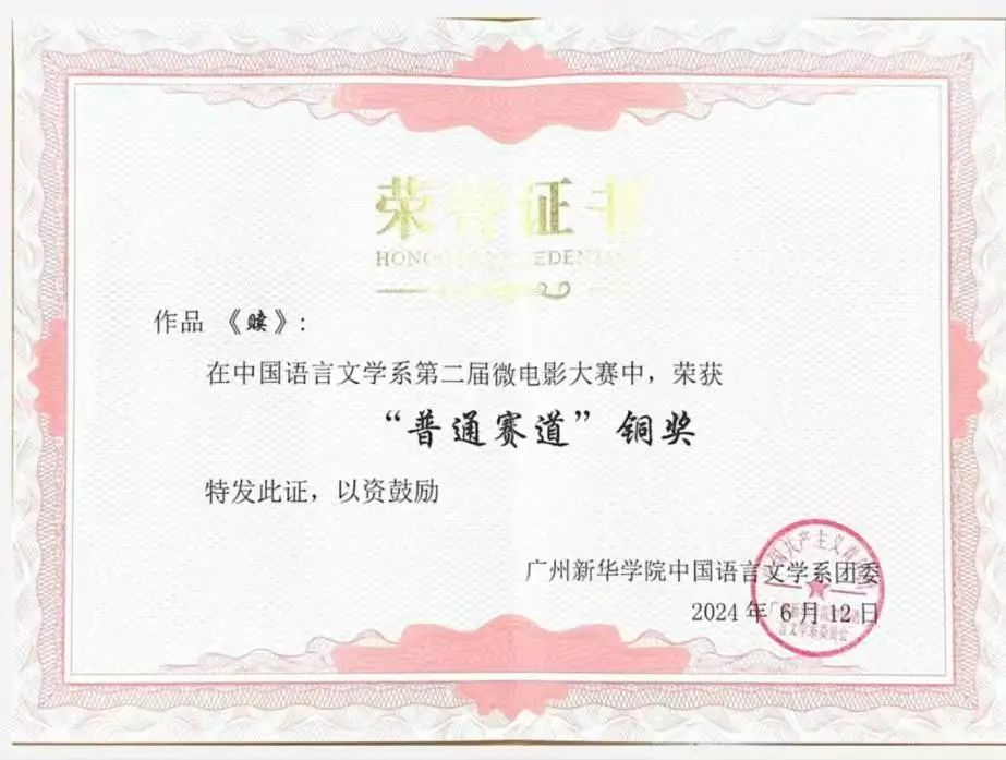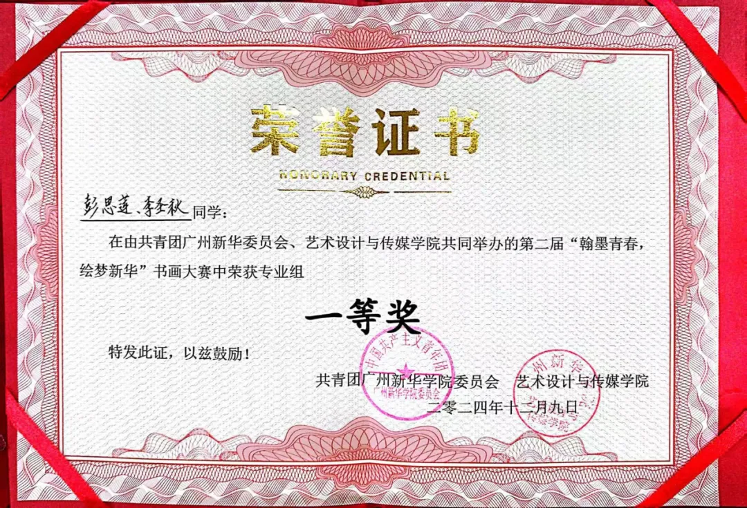 大一期间,综合测评排名专业第一,获2023-2024学年广州新华学院优秀学生一等奖学金;在2023-2024学年,被评为“广州新华学院优秀共青团员”、广州新华学院“优秀学生干部”、广州新华学院“三好学生”;荣获广州新华学院2023“国青杯”全国高校艺术设计作品展评的学生组三等奖、第二届全国大学生职业规划大赛优秀奖、第二届“翰墨青春,绘梦新华”书画艺术作品大赛一等奖、第二届全国大学生职业规划大赛优秀奖、2024青年大学生手绘艺术与创意设计作品大展征集铜奖和优秀奖、2024“谷都风华”中山三乡文旅产业人才创新创业创意大赛三等奖。