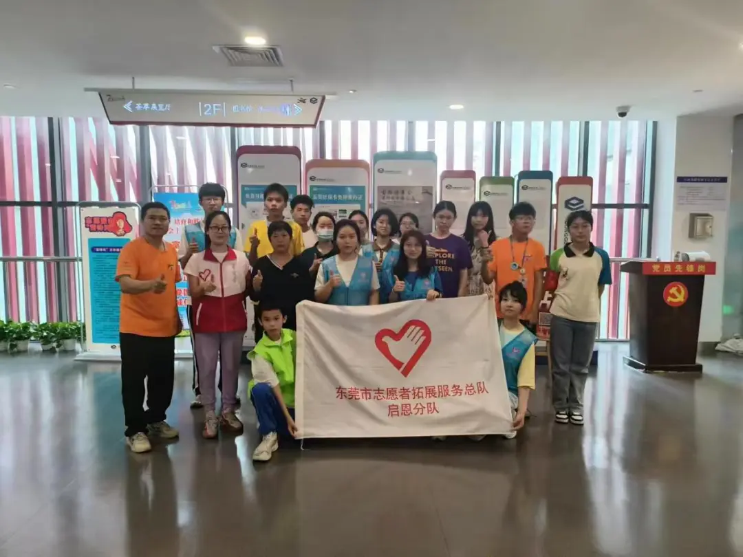 彭思莲在麻涌镇岭南水乡文化艺术中心麻涌图书馆整理书籍志愿的合影(站左五)