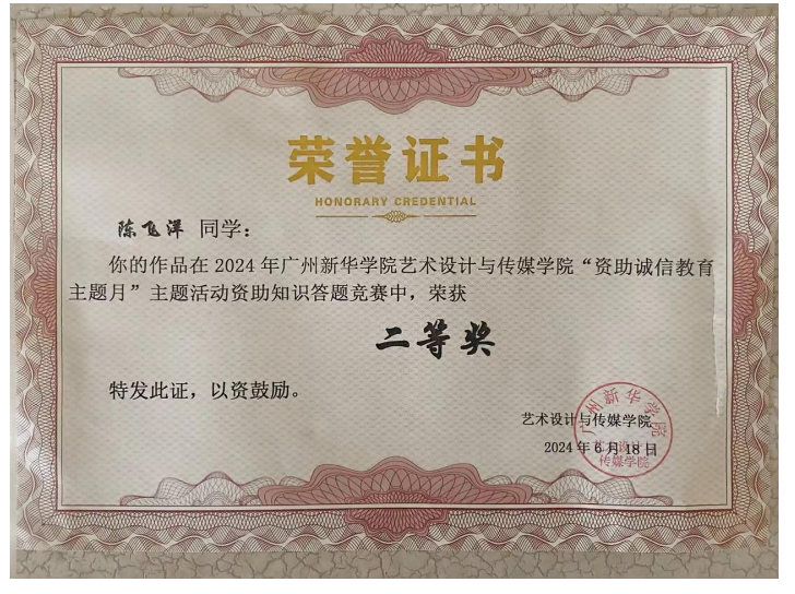 陈飞洋,女,共青团员,广州新华学院太阳集团2138网址,2138cc太阳集团官网入口2023级网络与新媒体专业、2023级逸仙新华班学生。在校期间担任班级学习委员,荣获广州新华学院一等奖学金、三好学生称号,以及第十三届东宝杯大学生创新创业大赛“优秀个人”和优秀奖、中国国际大学生创新大赛校内赛优秀奖、第四届国际当代青年美术设计大赛铜奖、第三届FA国际前沿创新艺术设计大赛铜奖等多项荣誉。在社会实践中,参与“百千万工程”突击队行动获校级培育团队称号及“第十七届广东大学生科技学术季暨第二届广东大学生乡村治理调研竞赛校内选拔赛”二等奖。