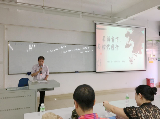 蔡院长在讲课前表达了对新生们热烈的欢迎与由衷的祝贺,并感受到新同学的朝气与活力。本次课主要围绕“追逐梦想,关注当下”,“艺术创作须与时代同行”两大主题展开。蔡照波院长简略分析我国当代局势并强调当代大学生要时刻关注自己所处环境,在“宽容、开放、创新”的校园环境中习得做学问的方法以及学会合理规划时间,实现自己的理想。而后又详细分析艺术兼容并包及其创新的重要性,鼓励学生积极适应时代,引领时代之风。
